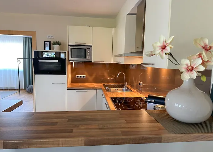 "Gluecksmoment" - Premium Apartments Seekirchen, Beeindruckende Ferienwohnung Mit Gemeinsam Genutzter Poolarea erbjuder gästerna ett komplett kök samt matplats. Flygplatsen Salzburgs ligger 20 km bort, och busshållplatsen Moedlham Volksschule ligger nära "Gluecksmoment" - Premium Apartments Seekirchen, Beeindruckende Ferienwohnung Mit Gemeinsam Genutzter Poolarea.